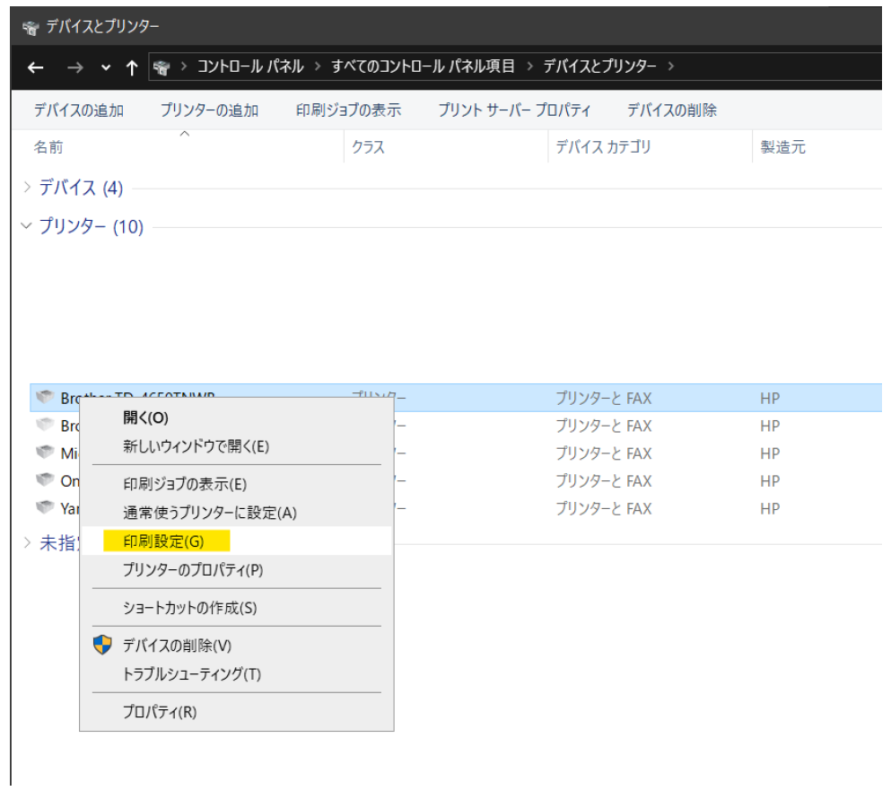 コントロールパネル > デバイスとプリンター の順に進み対象のプリンターを選択します。